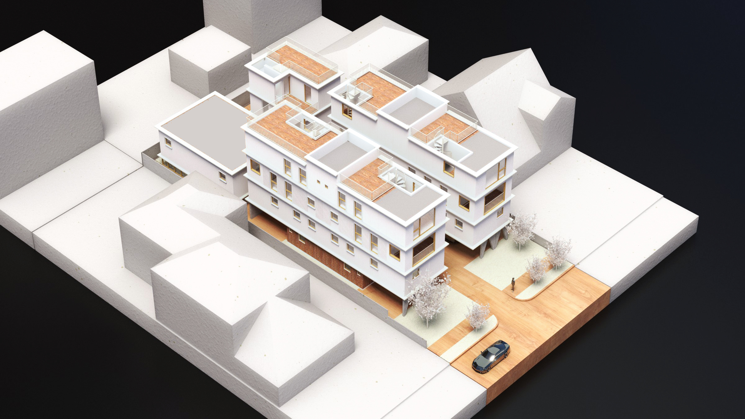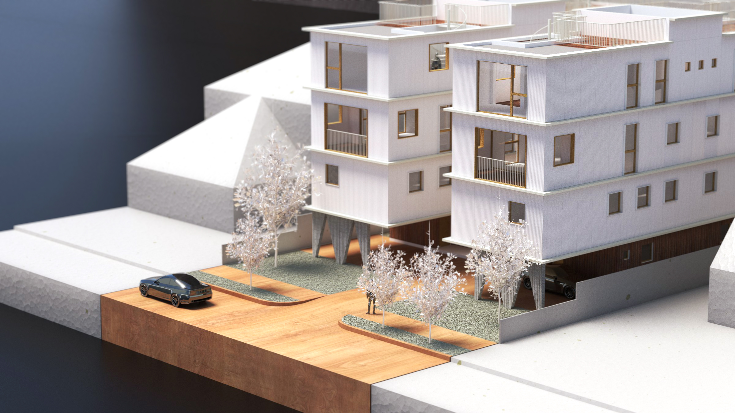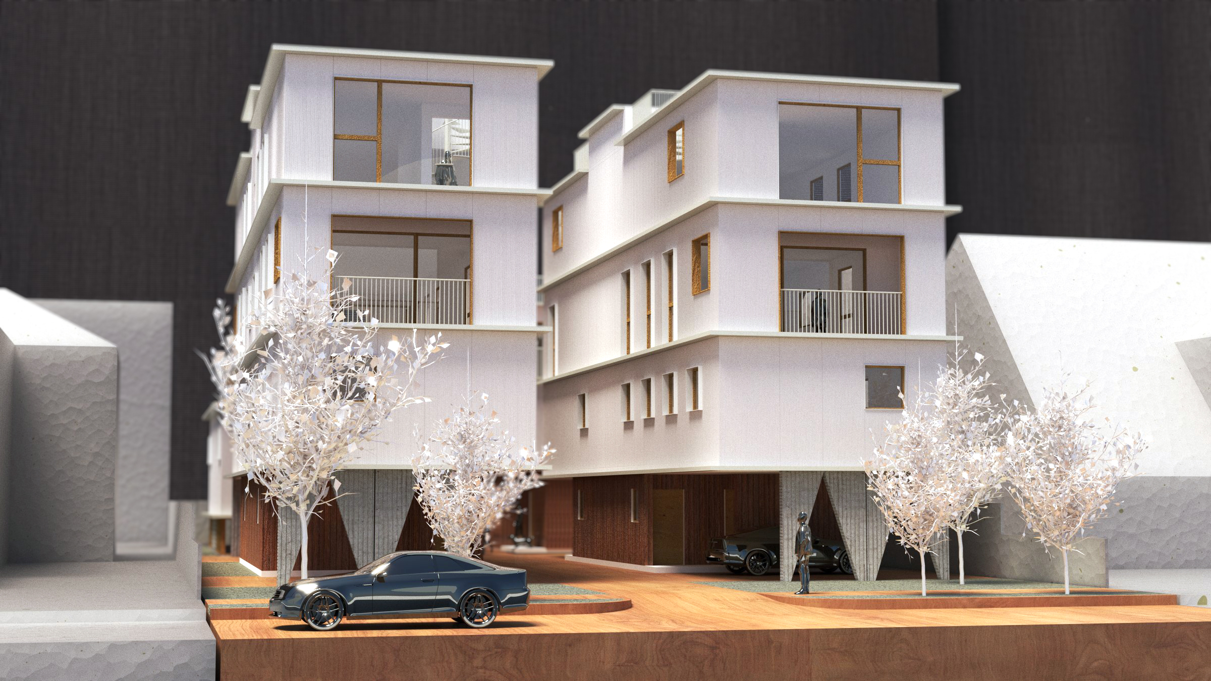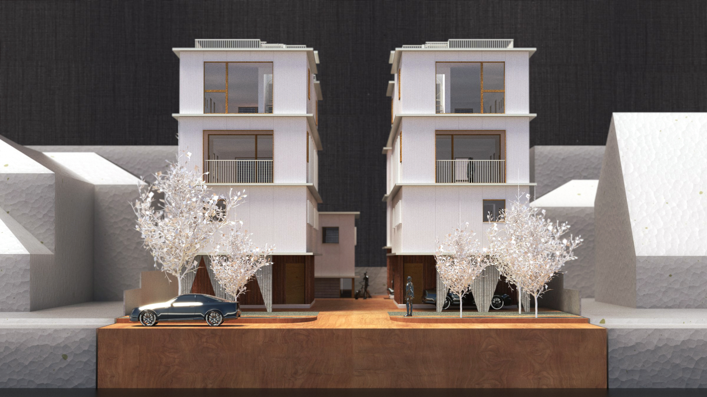 The design for the Van Ness homes aims to create an elegant presence and social community along Van Ness Avenue, a busy collector street in the heart of Hollywood. Instead of maximizing the site’s massing, we chose to break up the program into various volumes. This provides for a more sensible and contextual approach to the site for ample access to daylight and natural ventilation for each unit.